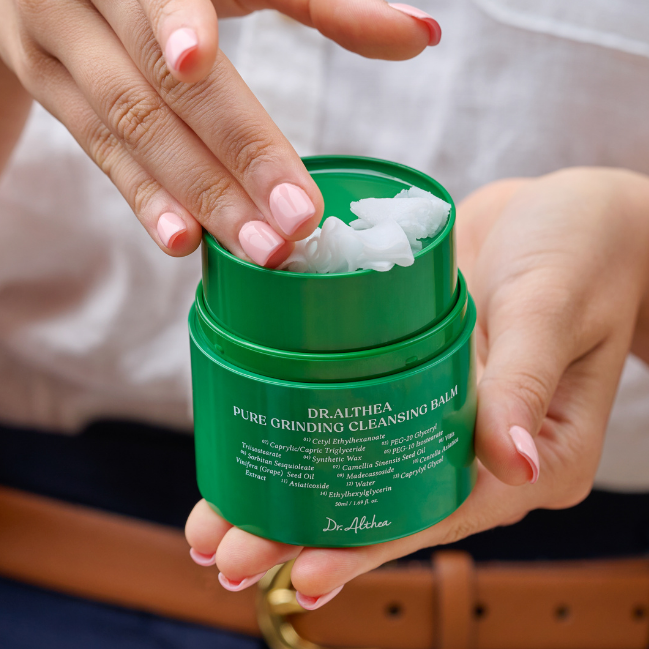 The Dr. Althea Pure Grinding Cleansing Balm is a hygienic balm cleanser with a built-in grinder mechanism that ensures fresh application every time. It’s formulated with 14 natural ingredients including Madecassoside, Centella Asiatica Extract, Asiaticoside, Green Tea (Camellia Sinensis) Seed Oil, and Grape Seed Oil. This balm melts away makeup, sunscreen, and stubborn impurities (even waterproof), yet leaves the skin feeling soft, hydrated, and non-tight. Fragrance-free, alcohol-free, and kind to sensitive skin, it’s great for skin burdened by sweat, sun exposure, or heavy coverage, helping to cleanse deeply while preserving moisture.
